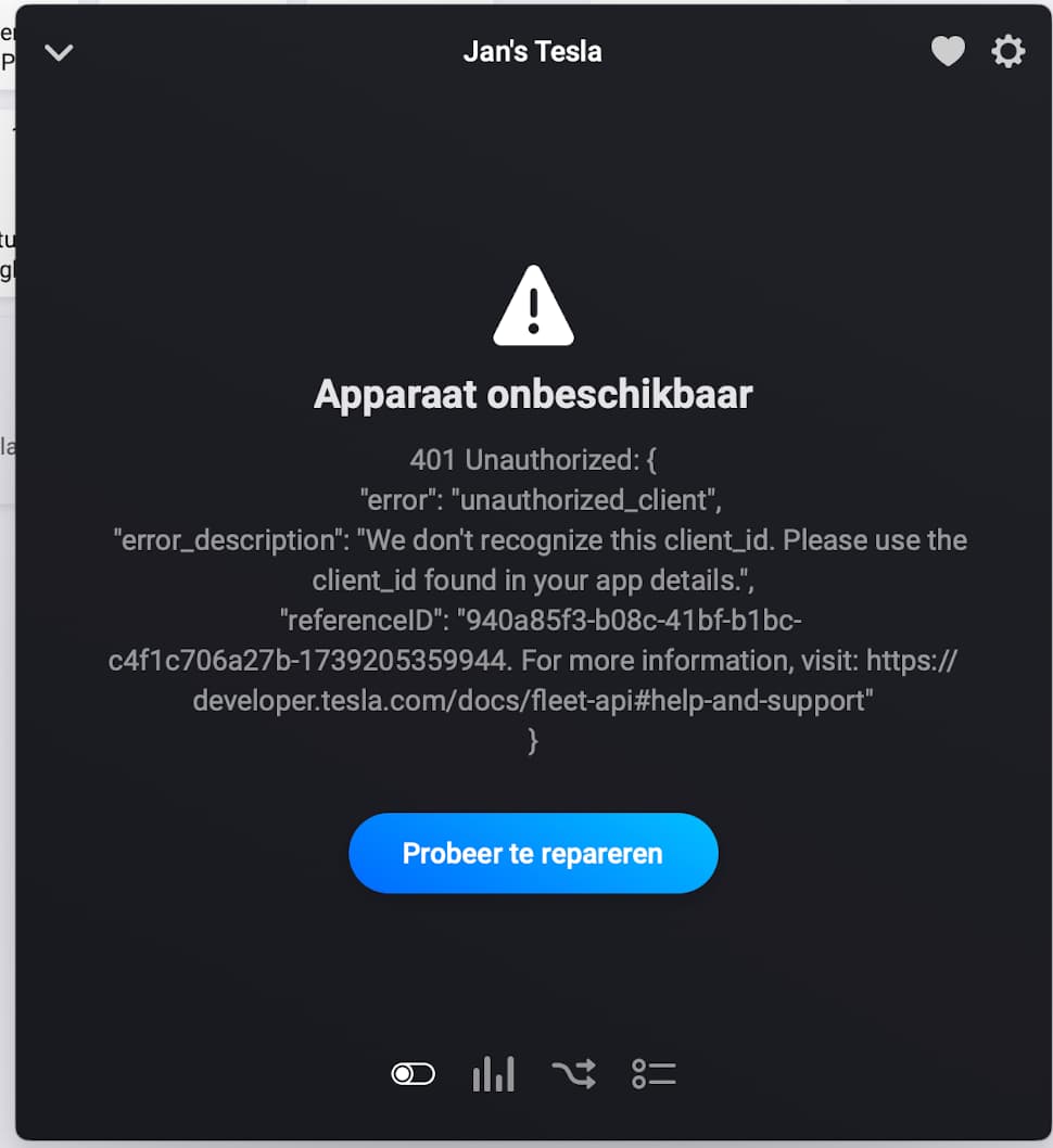 Ok, repaired. I saw the screen with the API credential and secret. It logged in (this time around I didn’t have to fill out my Tesla credentials using the MFA). Now I got back to the “vehicle” screen and everything seems up and running again.