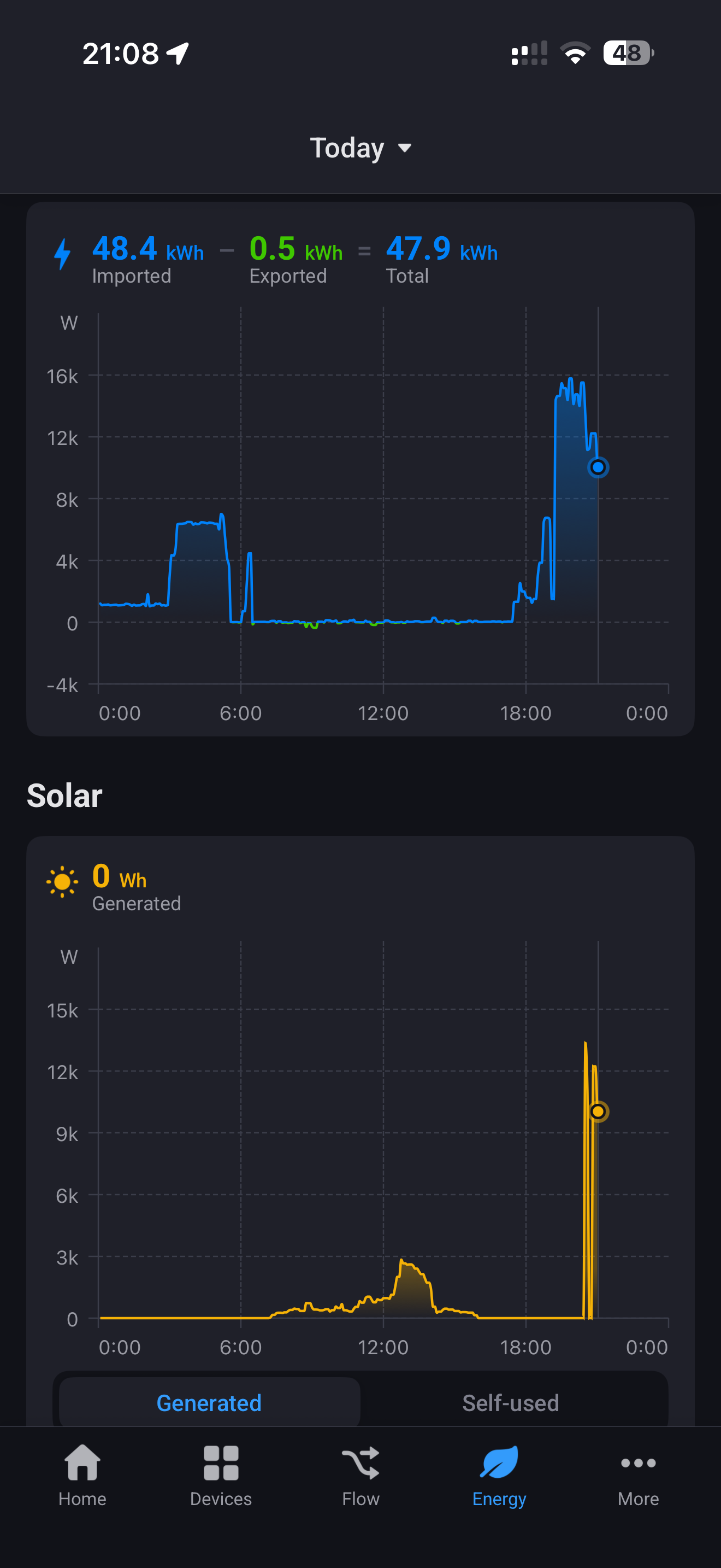 The solar chart in HomeyEnergy is showing your production from 12 to 14:00. In the eveneing, another device seems to report energy. The chart is showing measure_energy value of devices with class ‘solarpanel’. Do you have other dehices with this class (virtual devices, HA imported devices etc.) that have energy data with that amount?