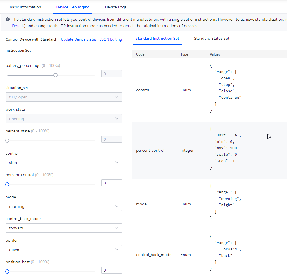 Login to the tuya cloud developer portal and look for device debug features. Below screenshot are a few of what my dehumidifier has.