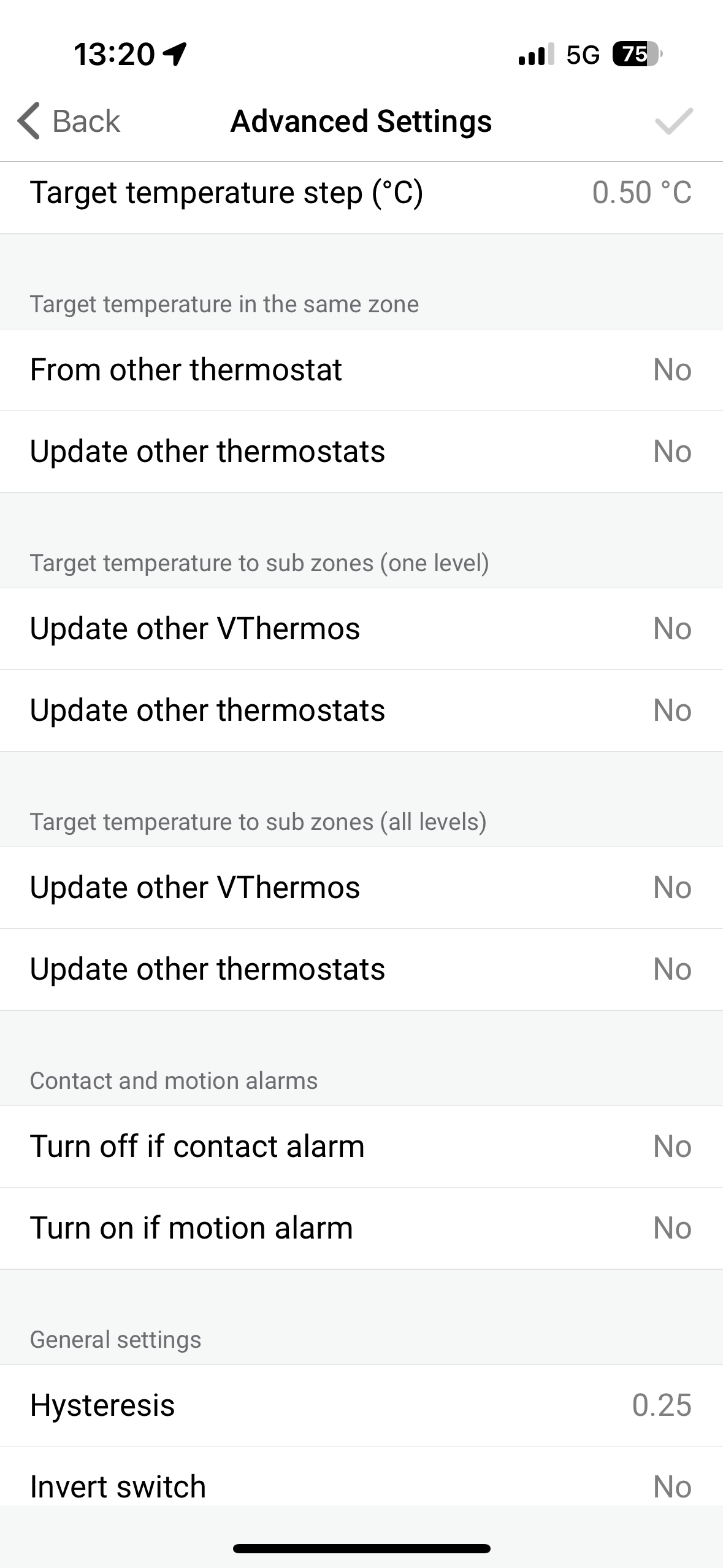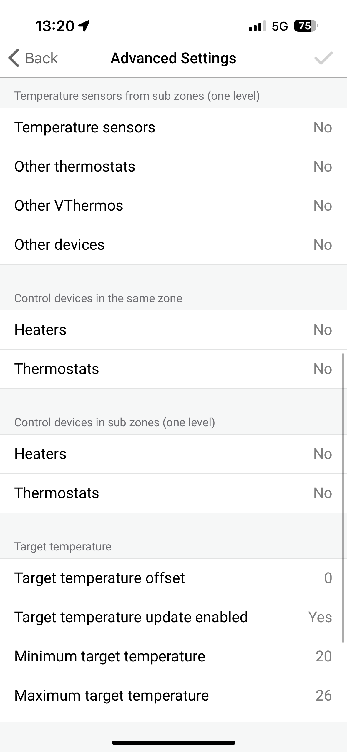 I have a tasmotized Sonoff TH16 switch that has temperature and humidity sensors. It is a device included in Homey via the app Tasmota MQTT. It works fine and temperature and humidity are well detected. I confined it into a zone and, in settings, put âHeaterâ in âWhatâs plugged inâ. I tried to control through VThermo, but no matter which VThermo settings checkbox I select, it doesnât work (which means that: VThermo doesnât show current temperature and subsequently I cannot activate/deactivate the switch raising or lowering the VThermo graphic control).