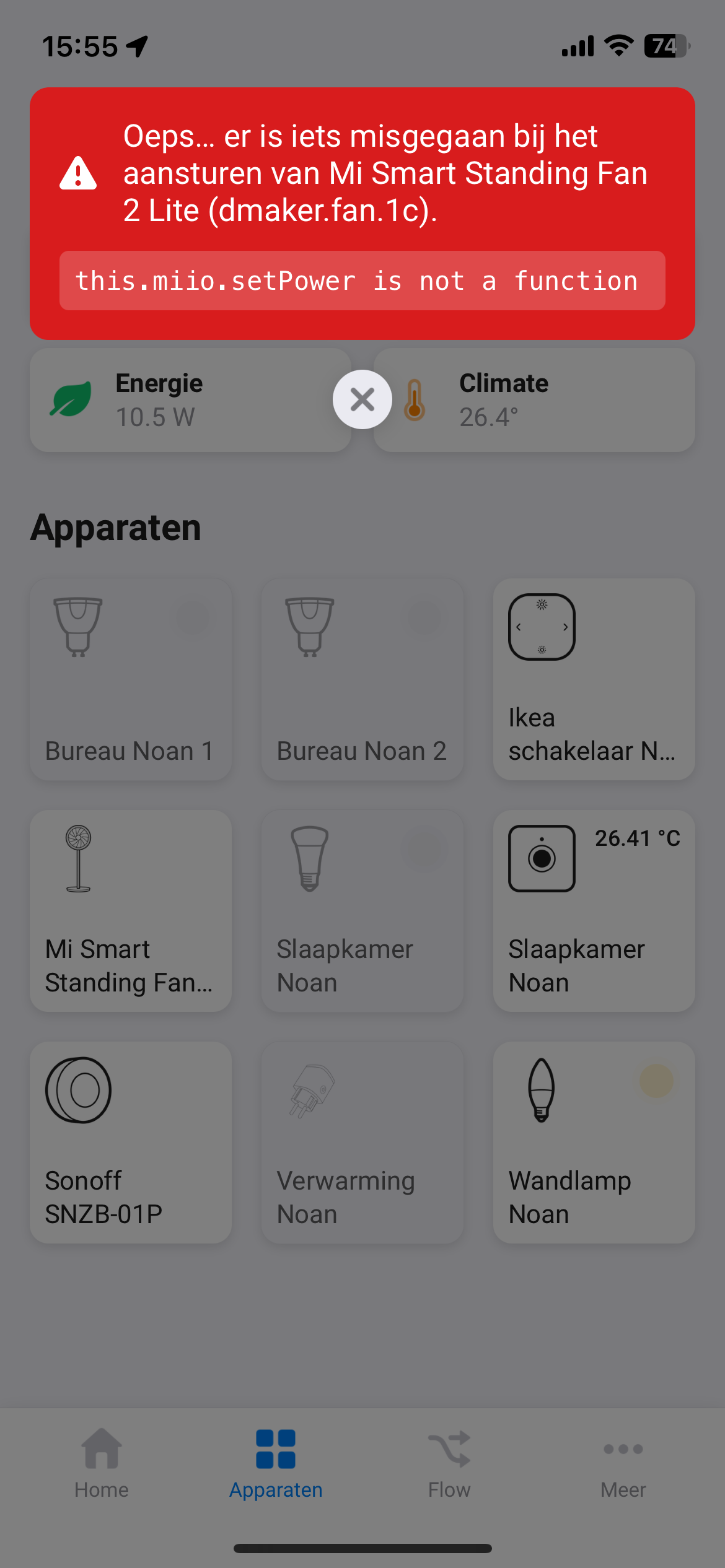 Iāve connected my Mi smart fan to Homey. Now when i want to put it on it says the following: