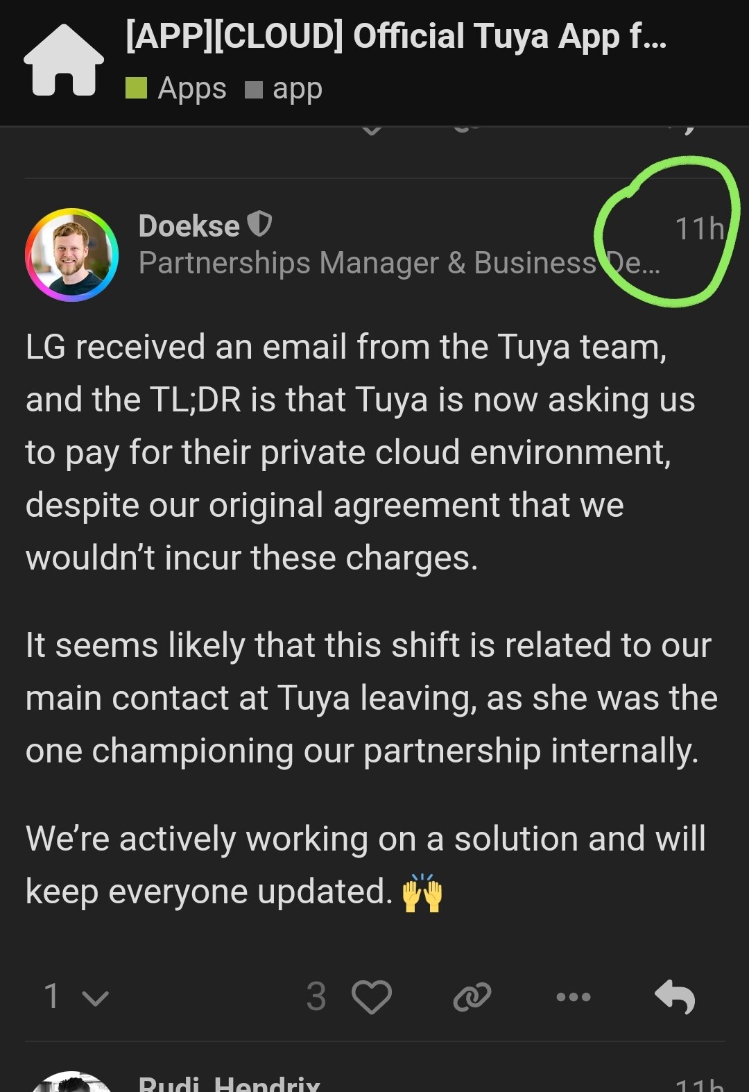 It is for a couple of days now that one of your official supported apps is down. Many people cannot control their devices which is frustrating. It is never a good idea to base a business relation on the informal link to an employee. There must be a sound contract in place between Homey/LG and Tuya? If note time to negotiate one now and solve the issue for the users. A clear update to the user community where we are would be very much appreciated. Should i wait till my devices can be controlled again or should i shop for alternatives? Many thanks