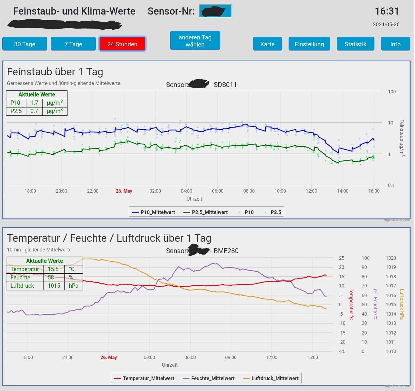 Bei Überschreiten der empfohlenen Werte, geben Homey und LaMetric entsprechende Alarme. Auch ganz nett sind die online verfügbaren Langzeitdaten