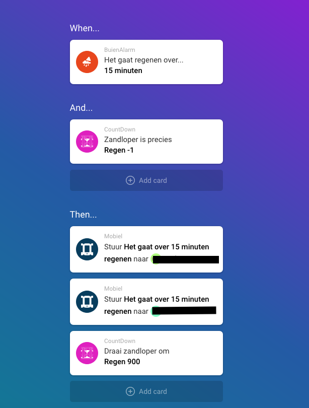 Thanks for your reply @RonnyW, I’m using BuienAlarm for the rain. But I notice that the notifications not always are being send somehow. Also on Buienradar. I will share my flow under this message.