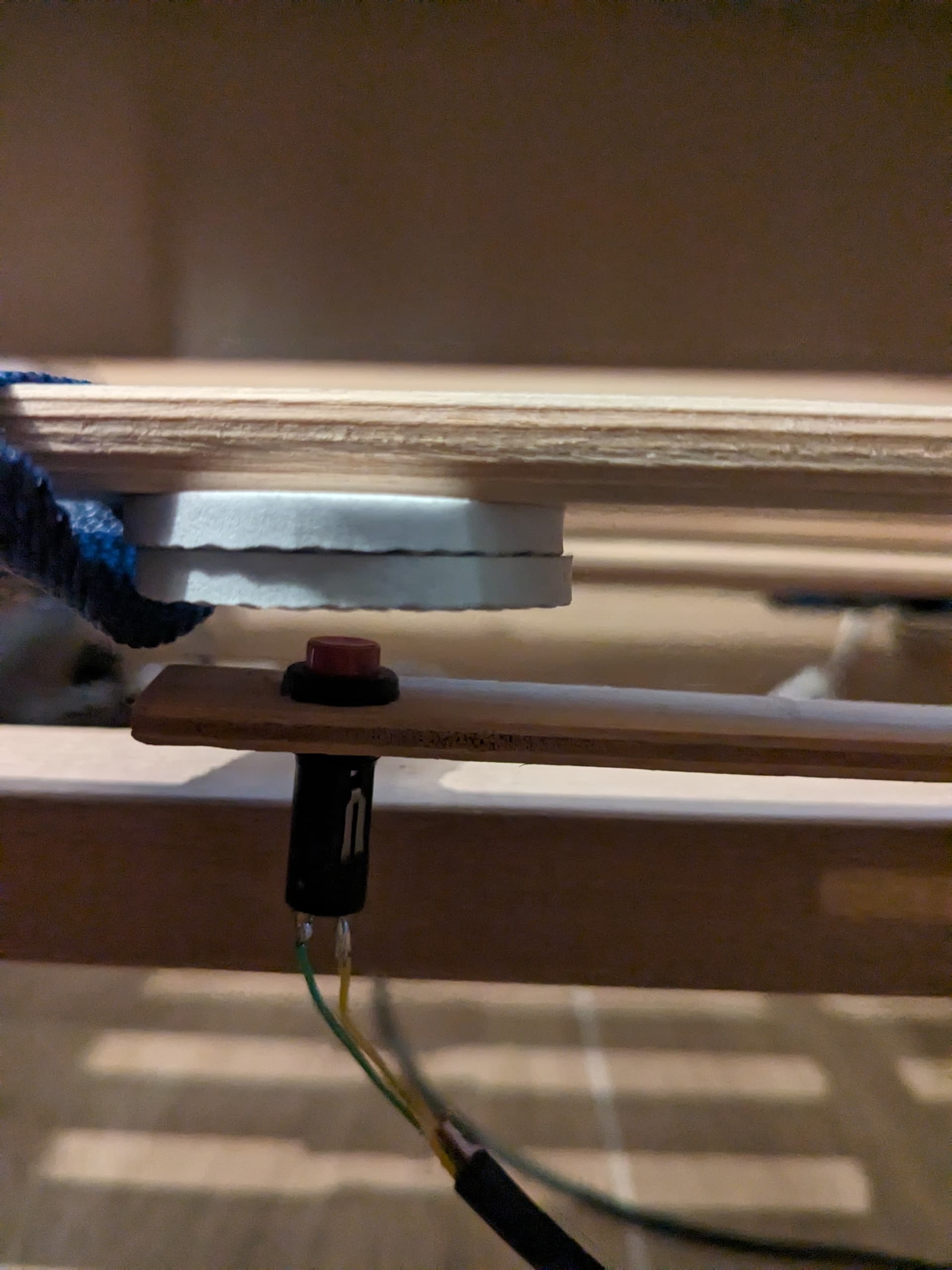 Bei dem Taster handelt es sich um einen kleinen Knopf, wie man ihn auch von Schaltpulten her kennt. Dieser ist am Ende einer dünnen Leiste befestigt. Wird diese Leiste nun an geeigneter Stelle unterm Bett angebracht, kann der Taster leicht schwingen. Das hat den Vorteil, dass durch den Druck von oben nicht zu viel Last auf ihm liegt, da er nachgeben kann. Allerdings muss dennoch ausreichend Druck von oben ankommen, damit zuverlässig erkannt wird, ob jemand im Bett liegt. Dafür sind bei mir zwei “Abstandspuffer” zum Einsatz gekommen, welche unter eine Latte des Lattenrostes kleben und bei Druck auf den Taster stoßen. Des Weiteren gibt es eine kleine, dünne Unterlegleiste, welche ebenfalls den Abstand des Tasters zum Lattenrost reguliert. Das ganze dann noch mit Schwachstrom versorgt und an einem Shelly i4 DC angeschlossen und schon ist der Kontakt einsatzfähig und mit Homey kompatibel.