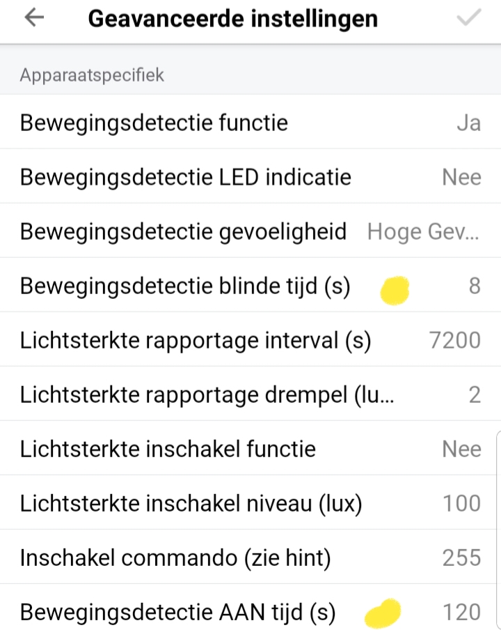 Om te testen zou ik de aan tijd zo kort mogelijk zetten (minimum is 60 volgens mij). De blinde tijd kun je op alles onder de 60 zetten voor het testen. Later kun je het aanpassen naar wat voor jou werkt. Mijn voorbeeld is uit de keuken waar hij dus vaak kijkt en pas na 2 minuten het licht uit gaat. Soms sta je nou eenmaal wel eens in je pan te kijken.