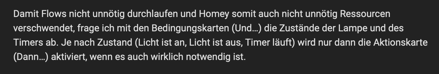 Und zuletzt könntest du den Flow umschreiben in: wenn Bewegung erfasst und Timer läuft nicht und es ist (nicht) nach Sonnenuntergang, dann schalte Lampe und Steckdose ein/ wenn Bewegung erfasst und Timer läuft, stoppe Timer. Somit muss Homey nicht immer auch die Sonnenuntergangs- und Anschaltkarten durchlaufen, wenn der Timer läuft.