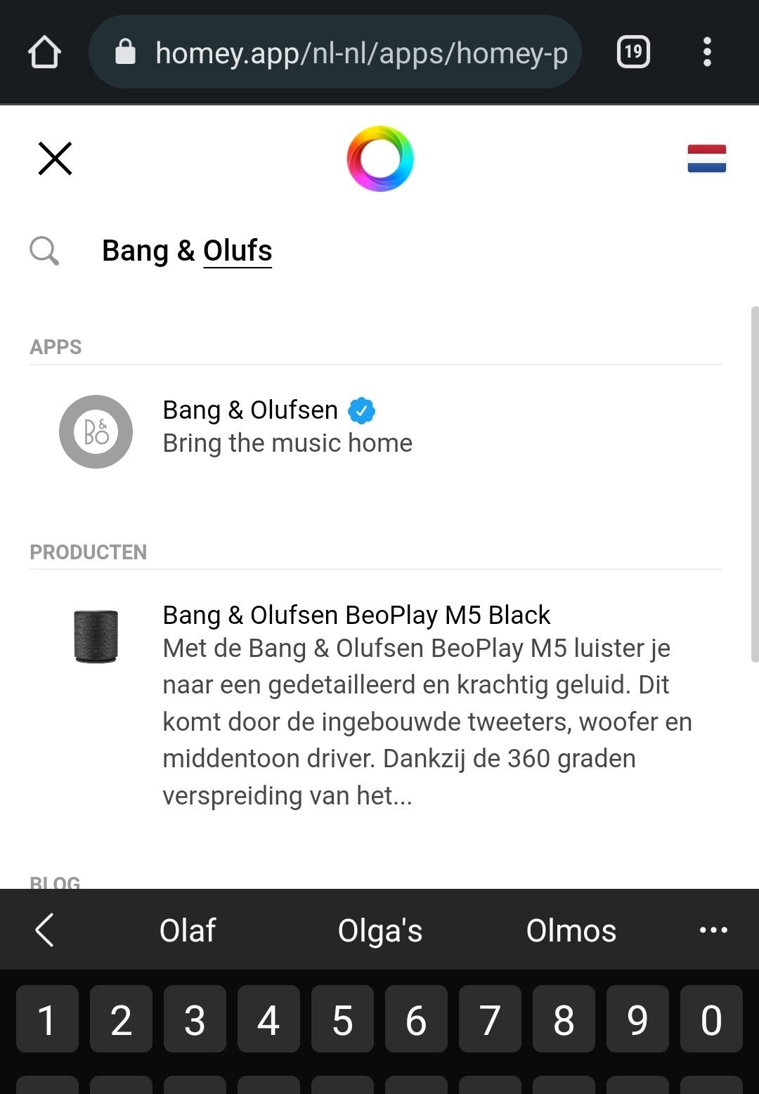 Jij zoekt via het vergrootglas (daarbij krijg je meteen de zoekresultaten te zien), maar het gaat mis met het zoekformulier op de app pagina (want de zoekopdracht wordt niet fatsoenlijk geurlëncodeerd).