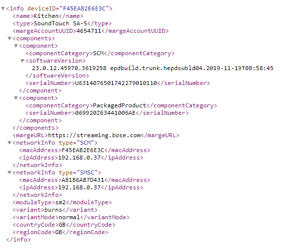 {“info”:{"":{"deviceID":"50658347CA74"},"name":["SoundTouch Wireless Link Adapter"],"type":["SoundTouch Wireless Link Adapter"],"margeAccountUUID":["5898267"],"components":[{"component":[{"componentCategory":["SCM"],"softwareVersion":["23.0.12.45970.3619258 epdbuild.trunk.hepdswbld04.2019-11-19T08:58:45"],"serialNumber":["U6240017802767121000010"]},{"componentCategory":["PackagedProduct"],"serialNumber":["074458F62440086AE"]}]}],"margeURL":["https://streaming.bose.com"],"networkInfo":[{"":{“type”:“SCM”},“macAddress”:[“50658347CA74”],“ipAddress”:[“192.168.1.11”]},{"$":{“type”:“SMSC”},“macAddress”:[“F0C77F5E7EAE”],“ipAddress”:[“192.168.1.11”]}],“moduleType”:[“sm2”],“variant”:[“binky”],“variantMode”:[“normal”],“countryCode”:[“GB”],“regionCode”:[“GB”]}}