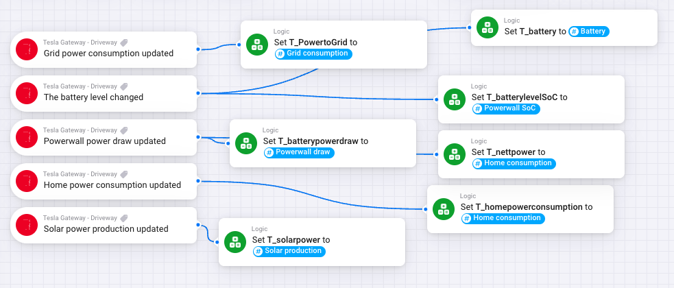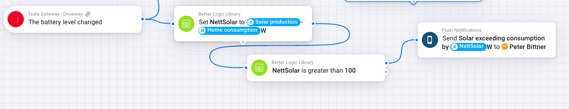 So I want to set up a flow so that when the Battery is being charged the maximum (-5000) and the Solar production is greater than 5000 + Home Consumption + “Some gap I can set” then turn on a device. I have included a picture of my variables and the flows I have developed to set the value of the variables. The values from the solar system update about every 4 secs.