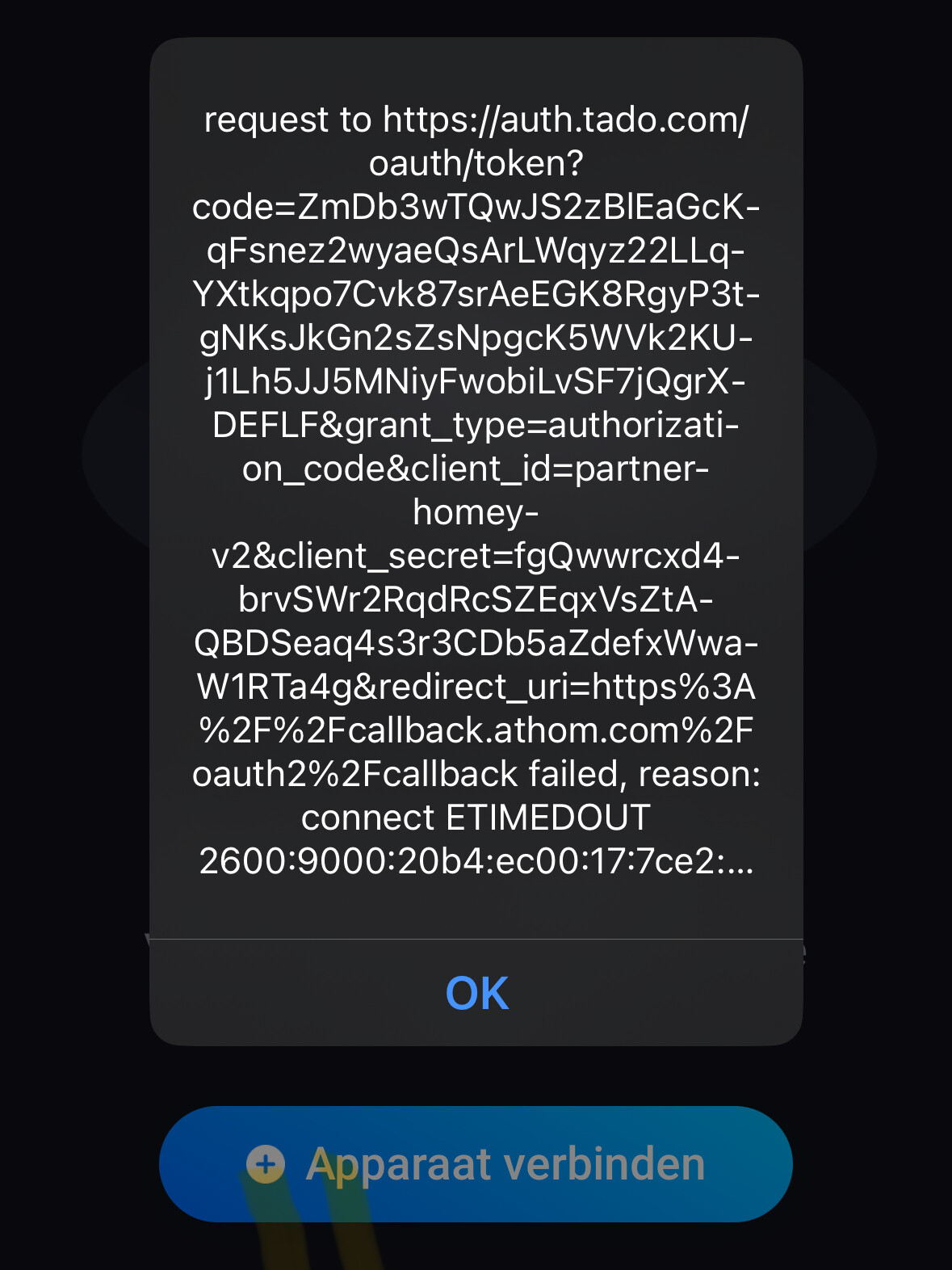 (With CGNAT you share your public IP address with others, so probably the tado authentication process can’t find your Homey Pro, and the request times out because of that)