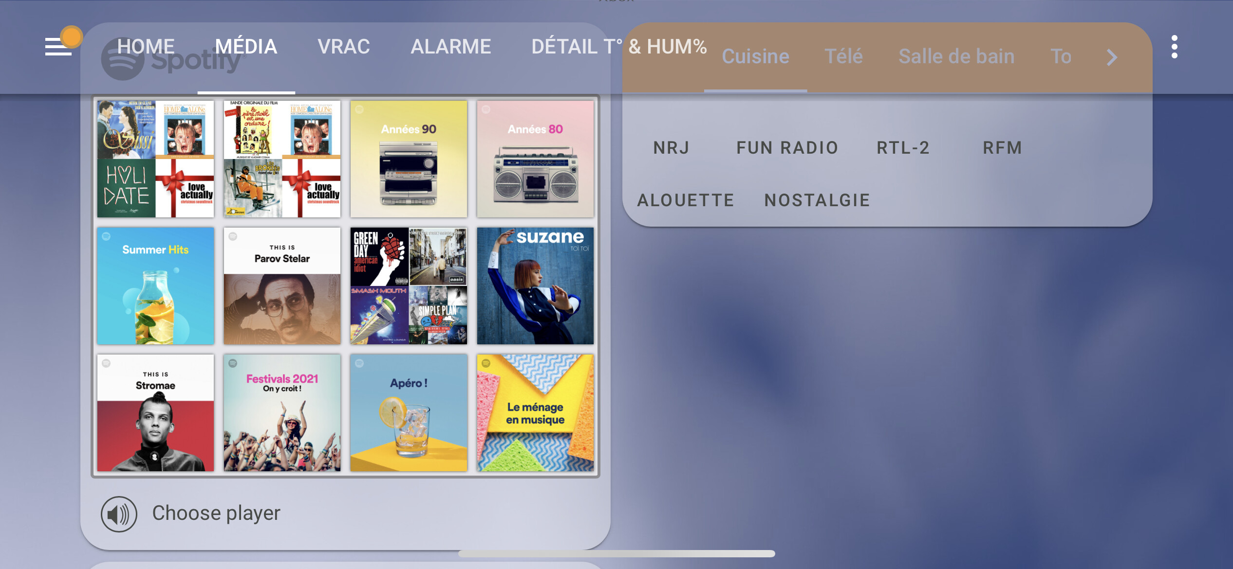J’utilise Home Assistant l’intégration Spotify fonctionne très bien. J’ai dédiée une tablette murale à ça. C’est encore en cour de mise en place pour la partie Dashboard mais ça ressemble à ça.