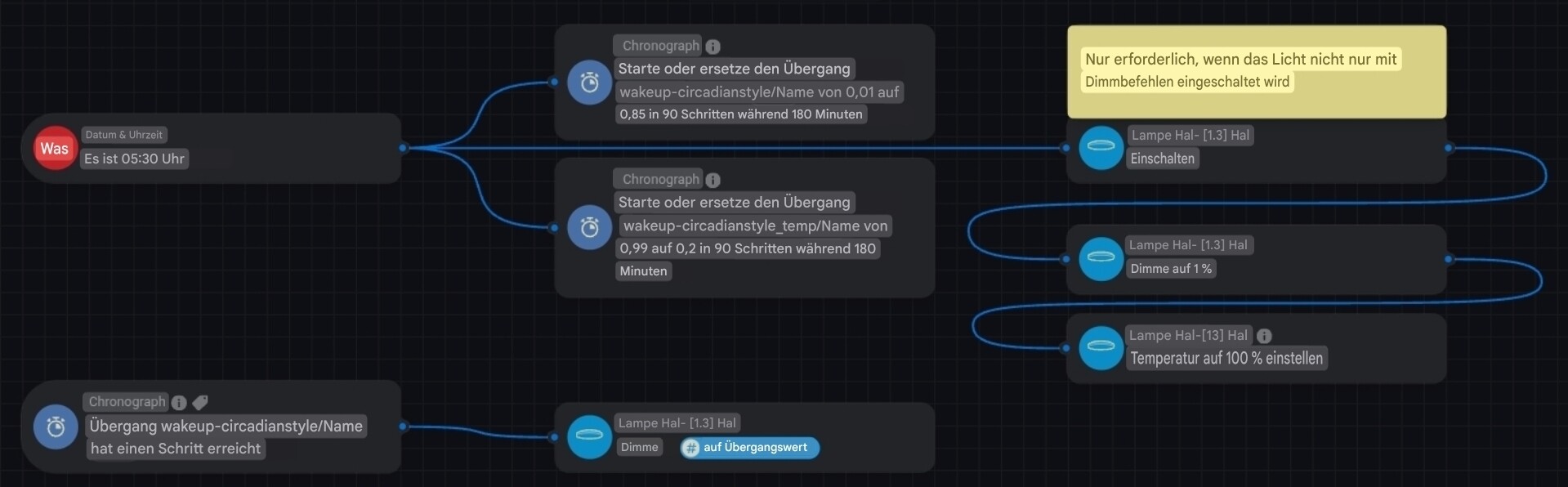 @Alter_Zausel, habe gerade durch Zufall die Homey App Dimmy entdeckt. Auch wenn ich die App selber noch nicht ausprobiert habe, ist die Realisierung eines Sonnenauf- als auch -untergangs vermutlich einfacher, als mit der Chronograph App. Was im Vergleich zur Chronograph App scheinbar nicht möglich ist, den Übergang mit einer Flow Karte zu stoppen. Vermutlich ist es nur durch Ausschalten der Lampe möglich.