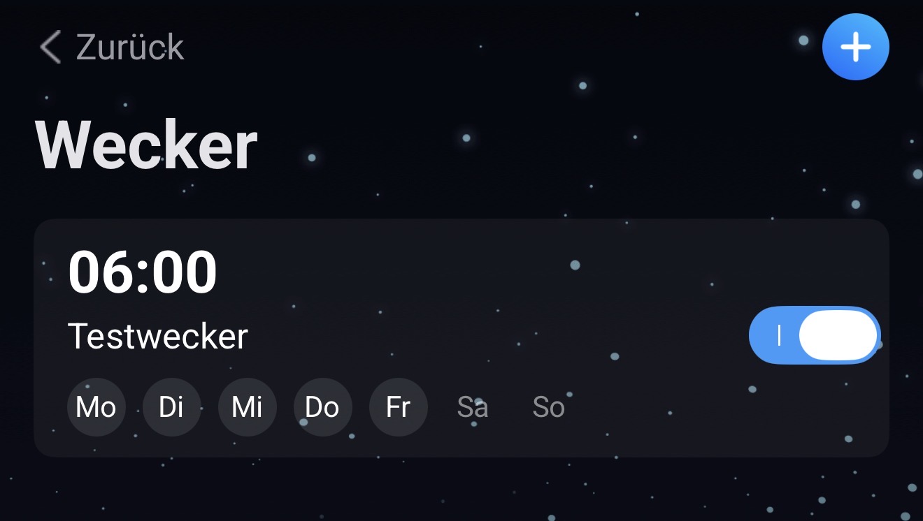 In der Homey Smartphone App unter Mehr → Alarme kann man einen oder mehrere Wecker erstellen, z.B. einen für Arbeitstage und einen anderen für freie Tage. Wenn man möchte, kann man den Wecker auch an mehreren Tagen automatisch wiederholen lassen. Hier in dem folgendem Beispiel z.B. Montags bis einschl. Freitags um 06:00 Uhr morgens: