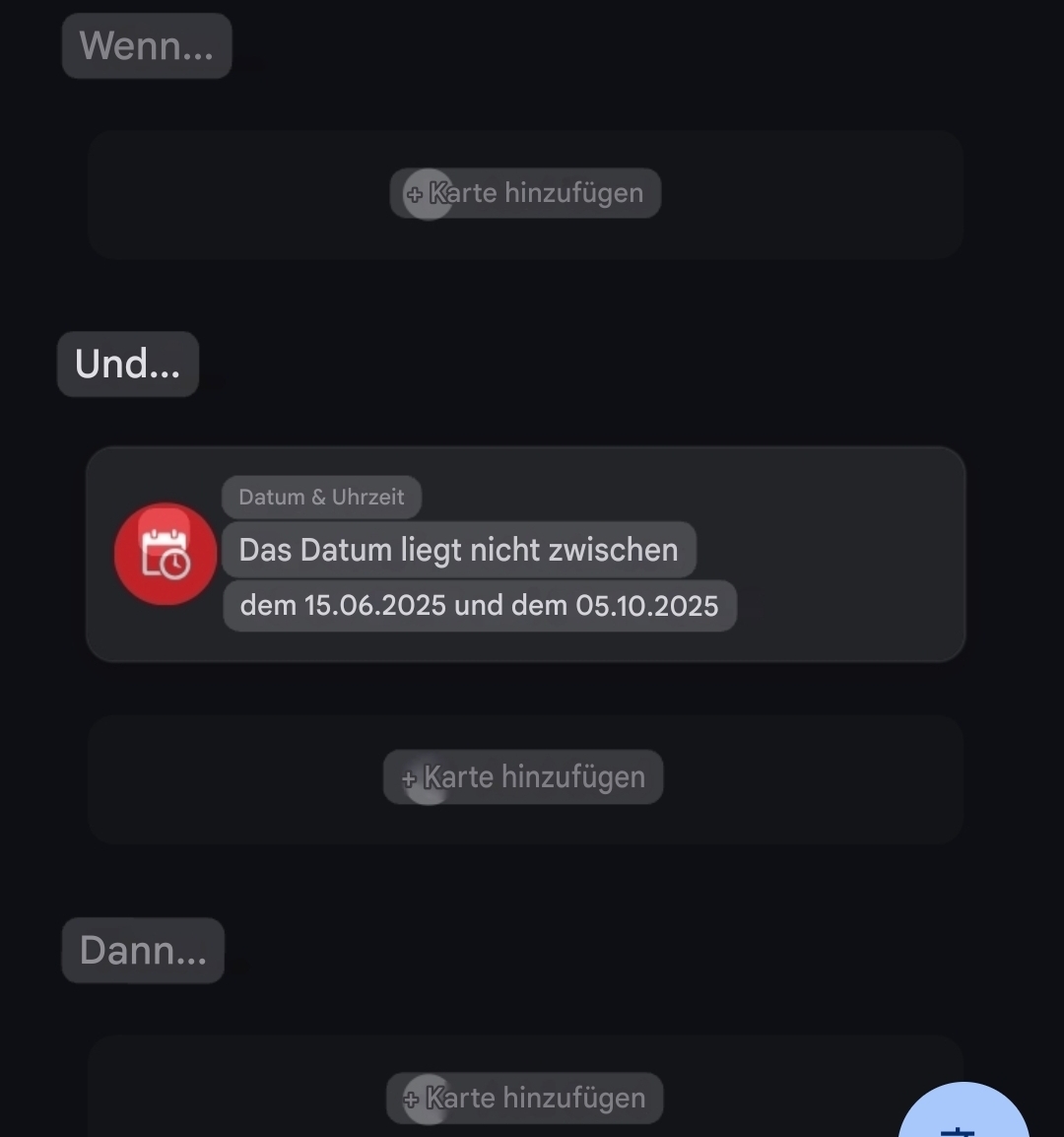 Im ‘UND’-Bereich können Sie die folgende Karte aus der Kategorie „Datum & Uhrzeit“ verwenden, und dann Gewünschte Daten eingeben. Wählen Sie anschließend „Umkehren“ aus.