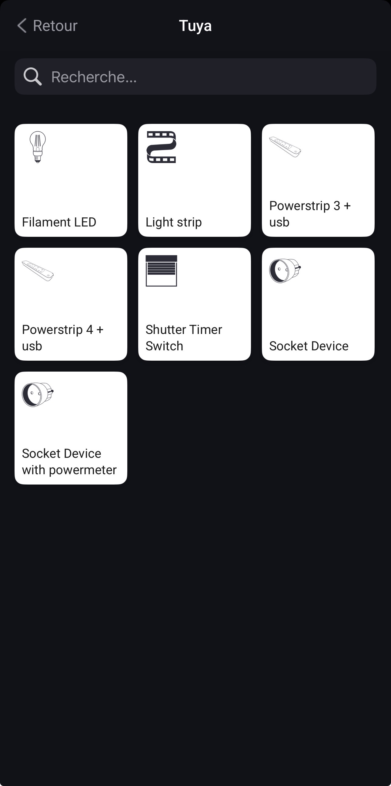 Select an app an check the supported devices. Tuya is Wifi based, so the MobileApp can’t search a device like it’s possible for Zigbee.