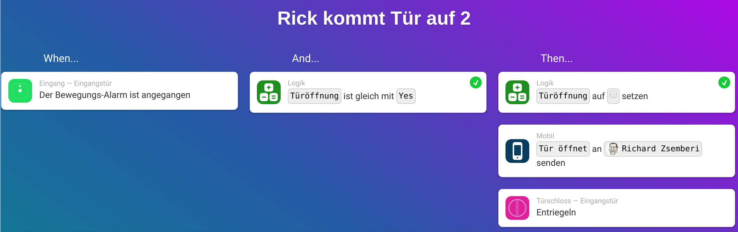 Durch diese Kombination wird verhindert das die Variable Türöffnung versehentlich auf “JA” gesetzt wird falls das Handy die Verbindung zum Heimwlan verliert und sich wieder verbindet.
