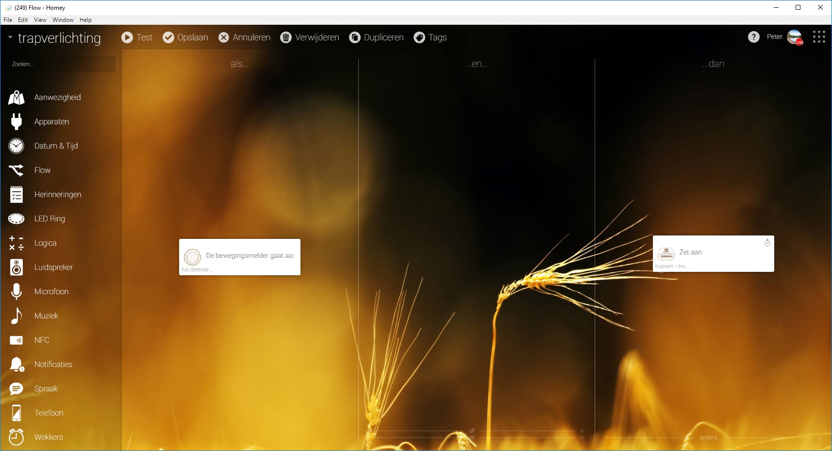 There is a tag called “Helderheid”. Drag a logic card in the middle colom and select “is groter dan”. Then drag the tag into the card.