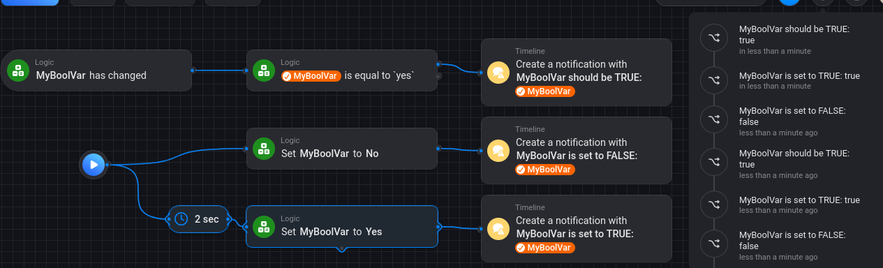 I have this flow where I set a variable, and to test it I’m doing something like “output current variable state, do actions, change variable, output state again”. The problem is that the first output gives the wrong value - which means the planned if test won’t work.