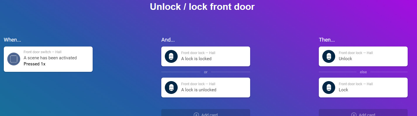 Hi Wim, nog niet helemaal goed zo want in de “and” kolom moet je het 2e kaartje “ a lock is unlocked” weghalen anders is een van beide altijd waar en zal je slot alleen unlocken.