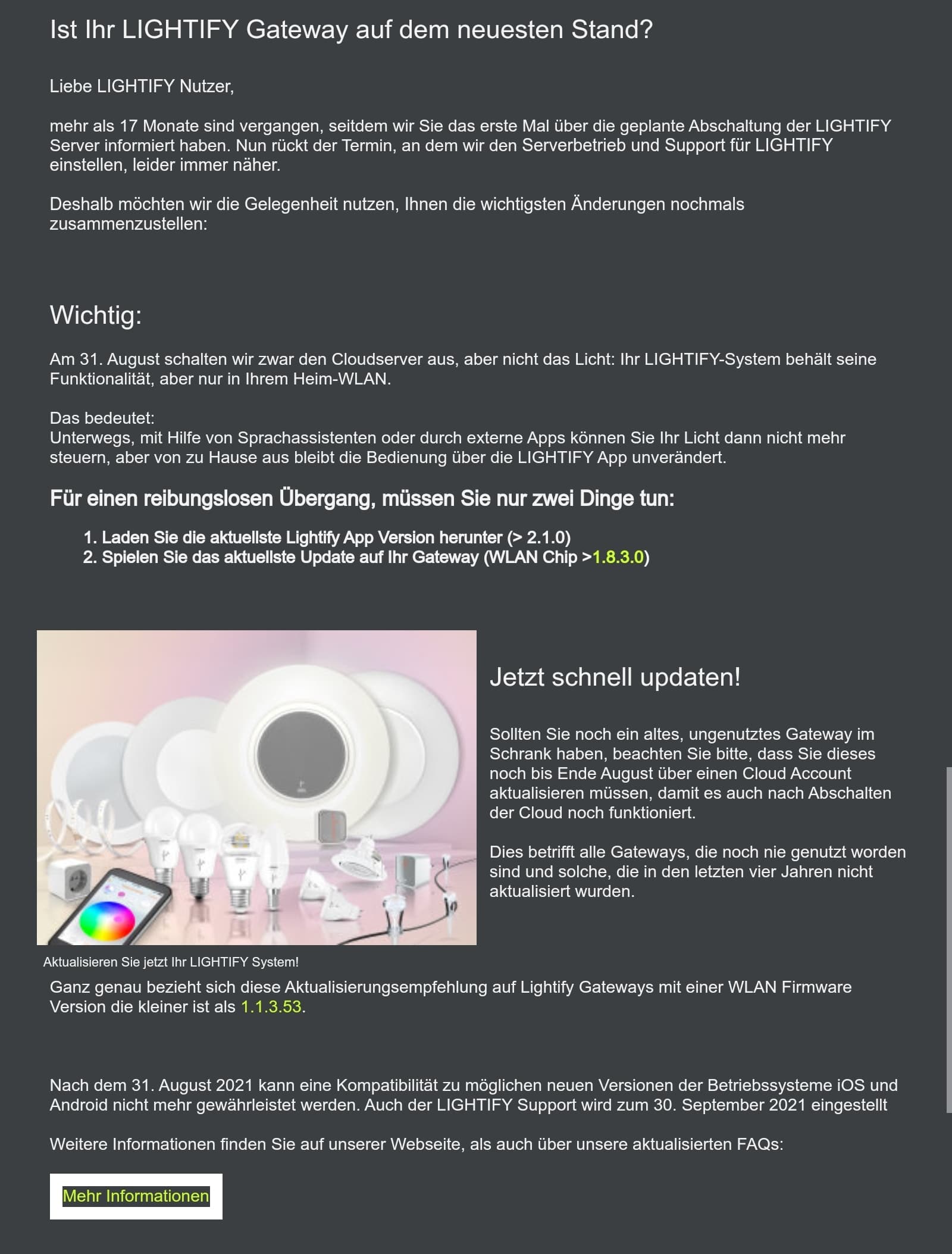 Die Lightify Server werden in Kürze abgeschaltet. Aber das war ja bekannt. Hier trotzdem die aktuelle Mail von Osram.