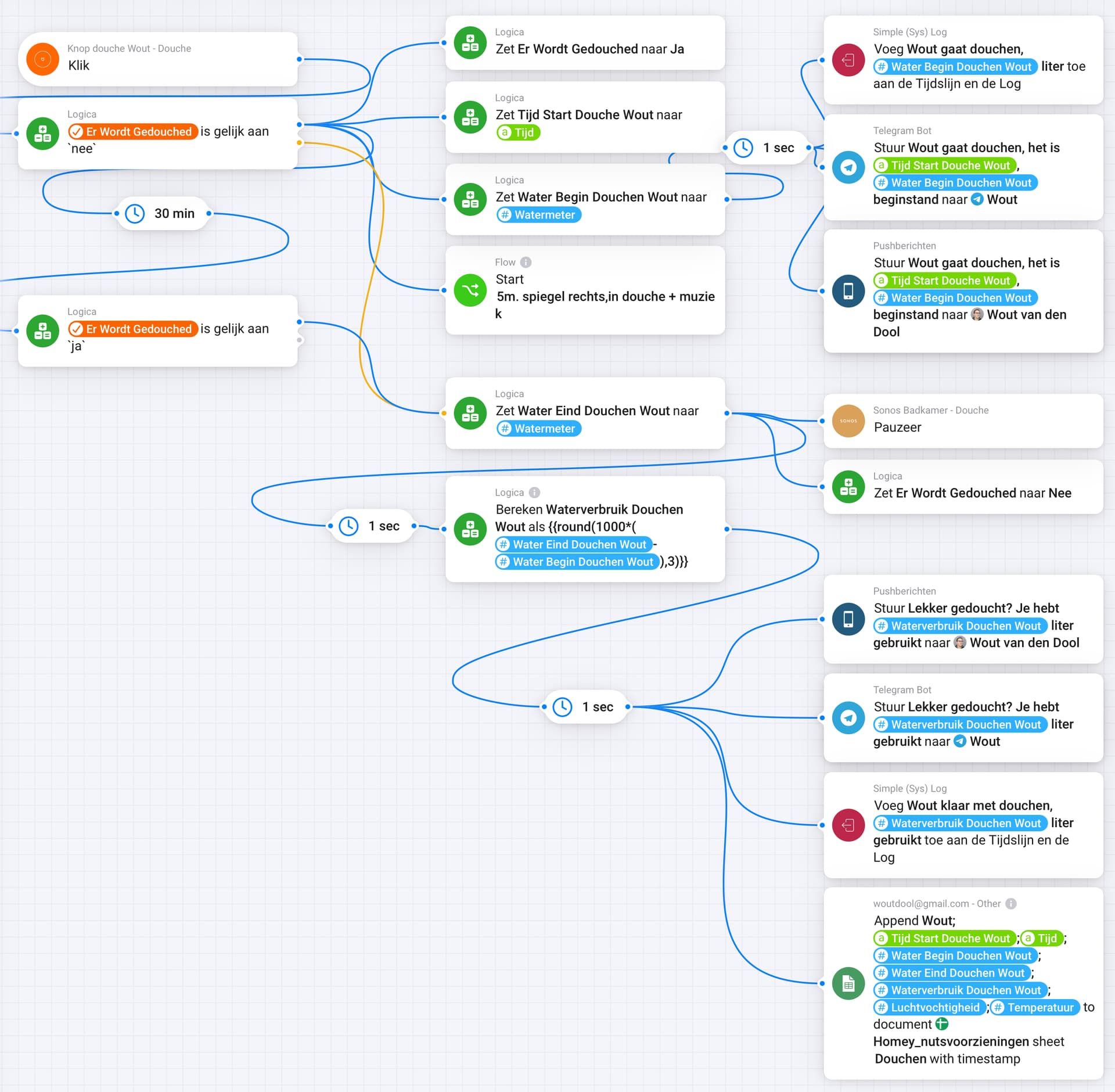 Start showering: When Button is clicked, check if I am already showering (variable set by this flow) and if not. switch on Sonos, Mirror, record watermeter on start and initiate Ventilation.