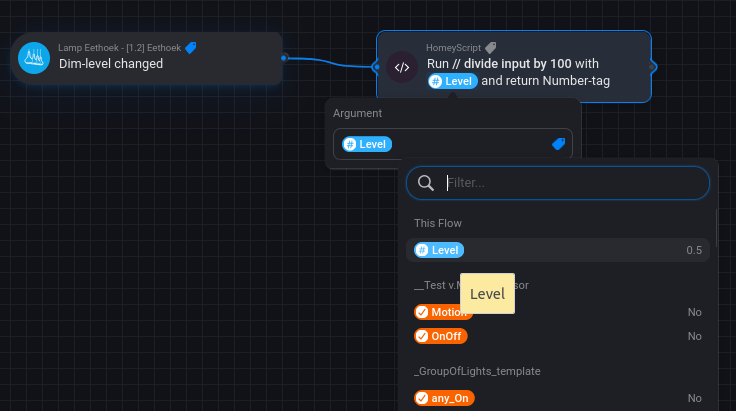 Example with the Homeyscript THEN card âRun code with Argument and Return number-tagâ