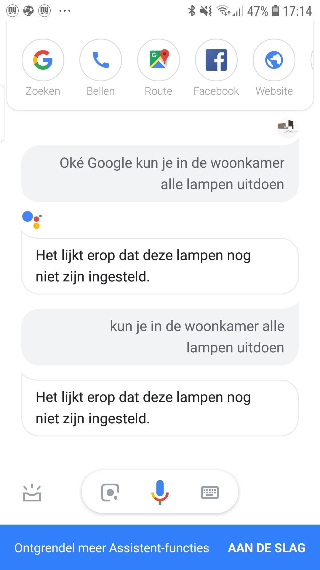 Ik vraag Google-assistent of hij de lampen in de woonkamer kan uitzetten.