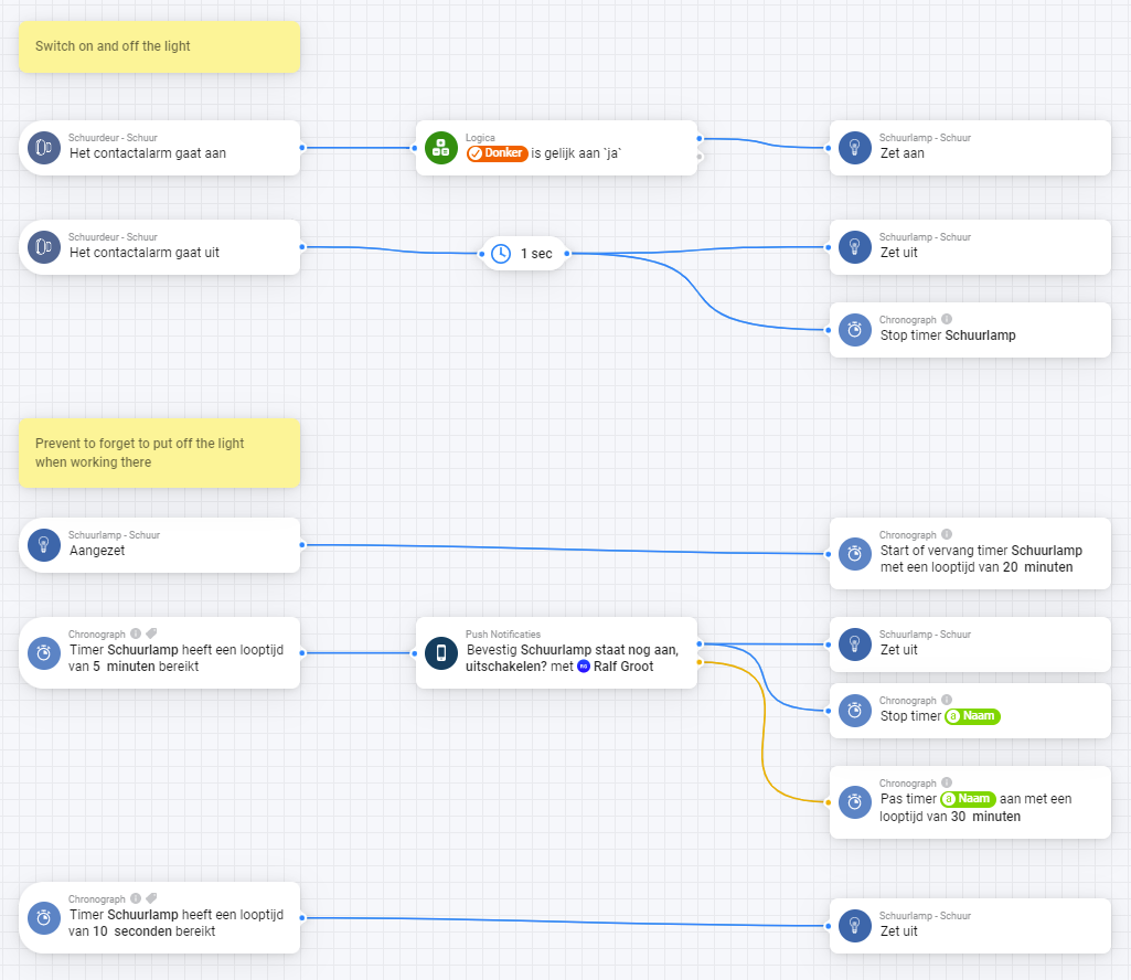 I made this flow ‘schuurlamp’ to put on the light of my shed using a doorsensor. Sometimes I’m working there for some time and put manualy on the light. To prevent forgetting it I made some extra steps reminding me and switching it off at the end.