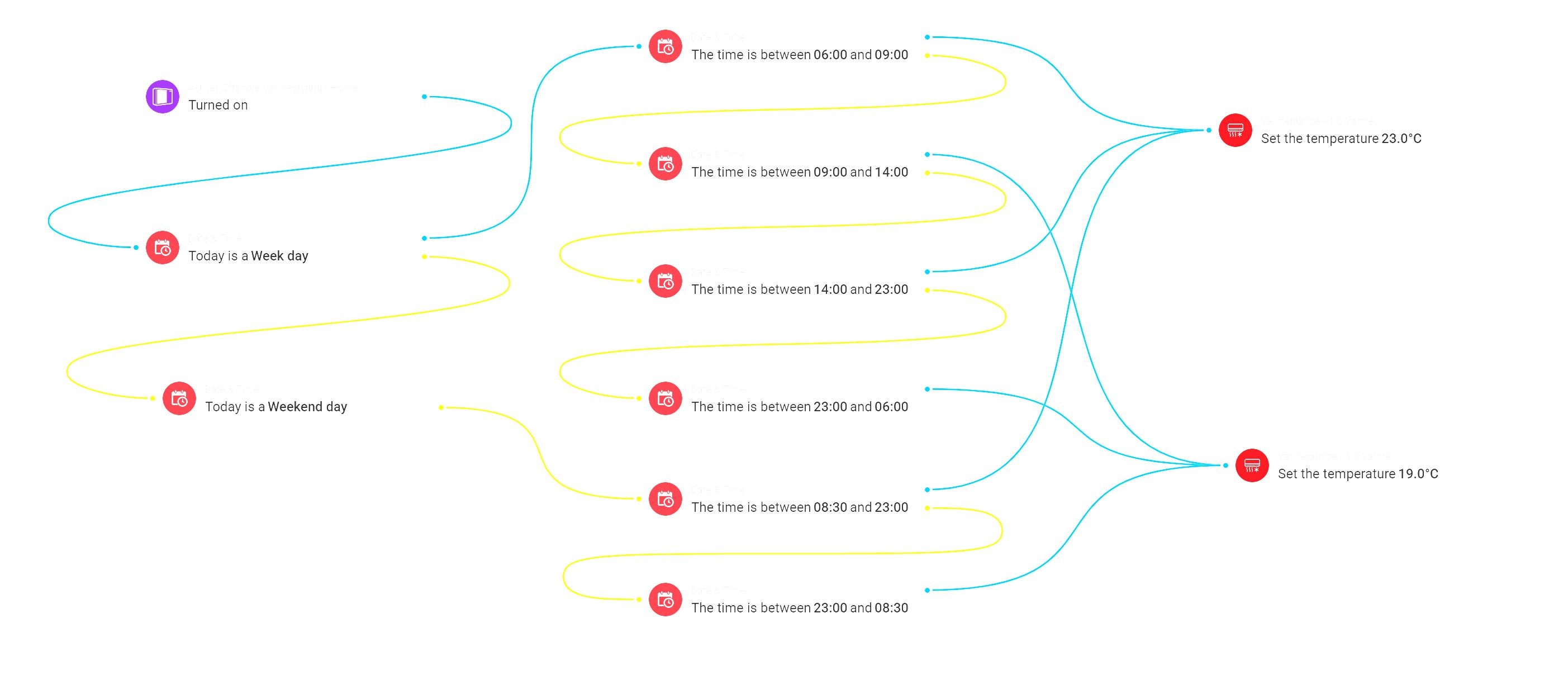 Fjern “Today is a weekend day” og la den gule fra “Is today a week day” gå til til klokksett du har satt (8:30 and 23:00)