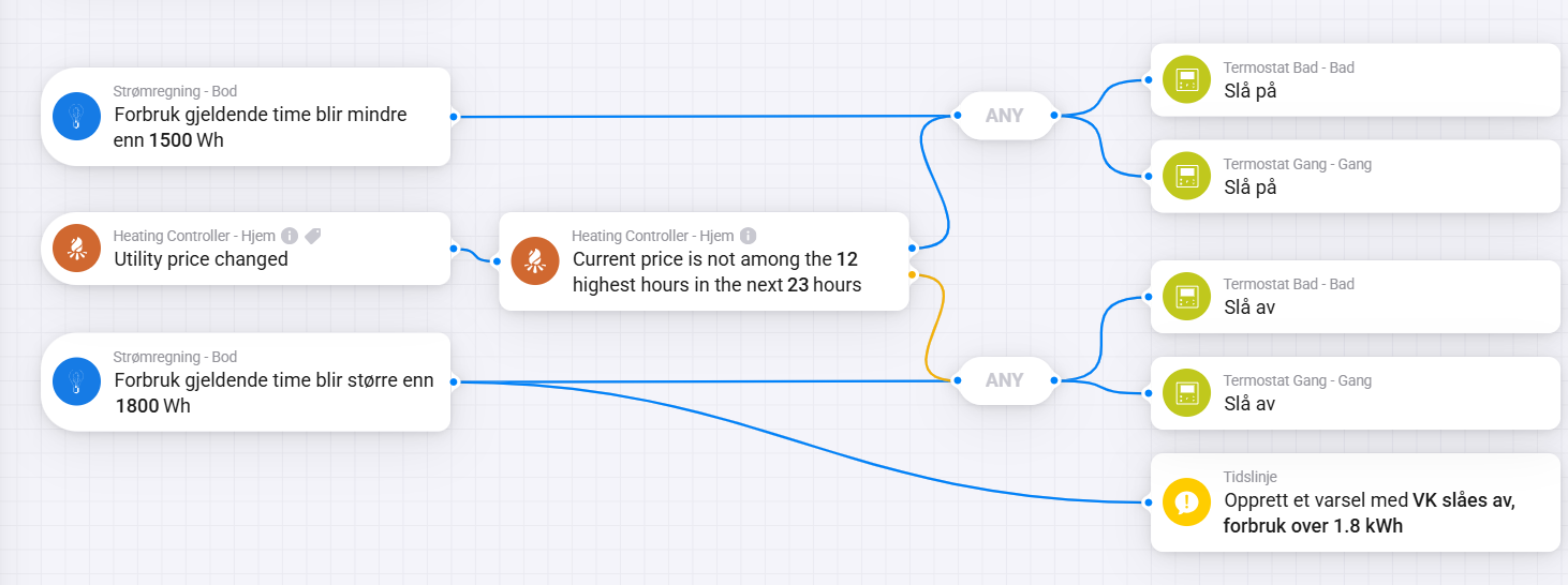 Problemet mitt er at jeg IKKE har Tibber (som jeg antar ville forenklet dette noe da jeg kunne hentet strÞmprisene rett fra dem). Mitt hovedmÄl er Ä holde meg innenfor/ under effektledd 10kw. Enn sÄ lenge har jeg heller ikke smart Elbillader slik at jeg tenker jeg vil klare dette hovedsakelig ved Ä unngÄ lading, vvb, all gulvvarme og andre standardforbruks-element samtidig. Selvsagt et mÄl og ogsÄ fÄ mest mulig til Ä utnytte den berg og dalbanen strÞmprisene har utviklet seg til ved Ä unngÄ de dyreste timene. Er fremdeles litt frem og tilbake om jeg skal bruke sparegris (som virker Ä automatisere mye nÄr satt opp) vs strÞmregning (hvor det meste mÄ settes opp med flows) - om jeg har forstÄtt disse appene rett