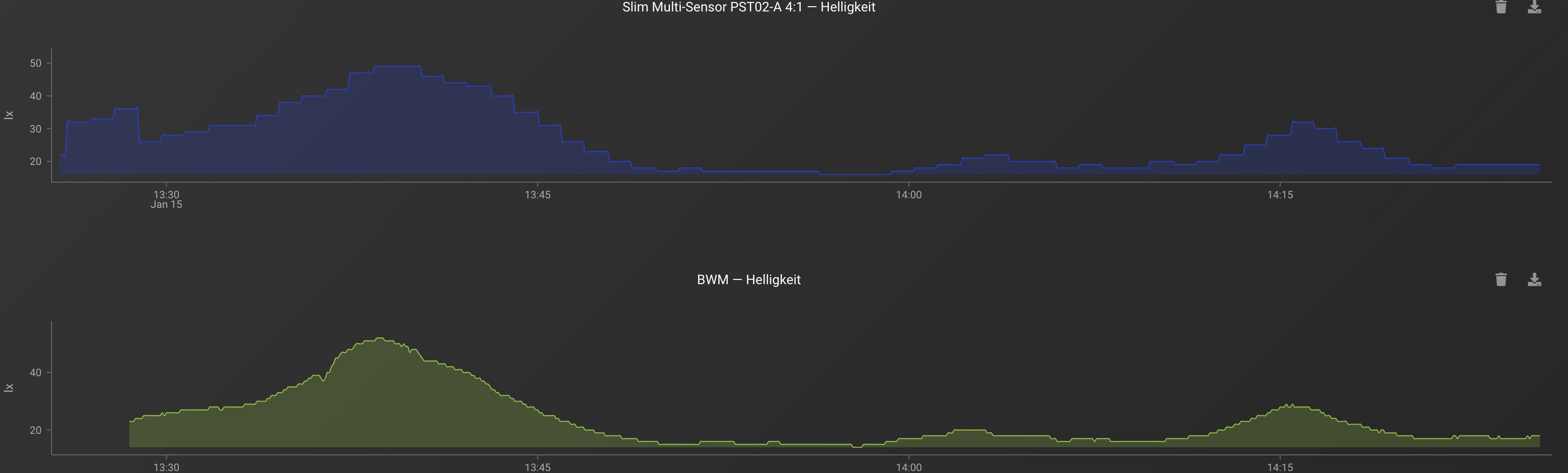 Sobald der Lichtsensor nicht direktem Licht ausgesetzt ist, wird es schnell „dunkel“, das habe ich. Die ermittelten Werte scheinen aber ja zu stimmen, da die beiden Graphen nahezu deckungsgleich sind. Die unterschiedliche Auflösung liegt entweder an den Sensoren, eher aber an den Einstellungen.