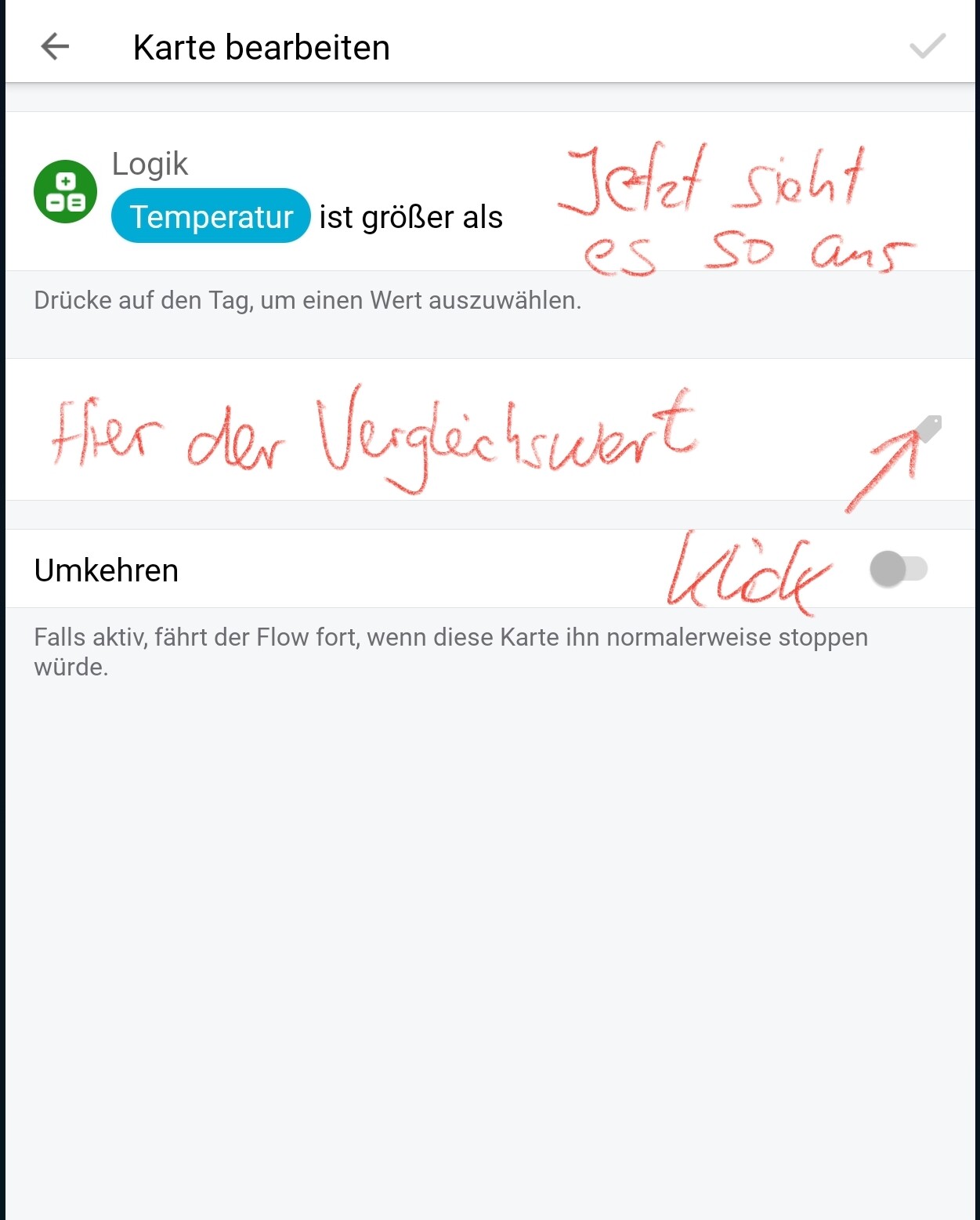 Ich finde aber einfach keine passende Flow-Einstellung, um die Abfrage zu starten und selbst, wenn ich die fände, ballert mich das System wahrscheinlich die ganze Zeit mit Nachrichten voll, dass die Temperatur draußen höher, als drinnen ist (könnte ich mir vorstellen, da ich noch keinen “Timeout” gefunden habe).