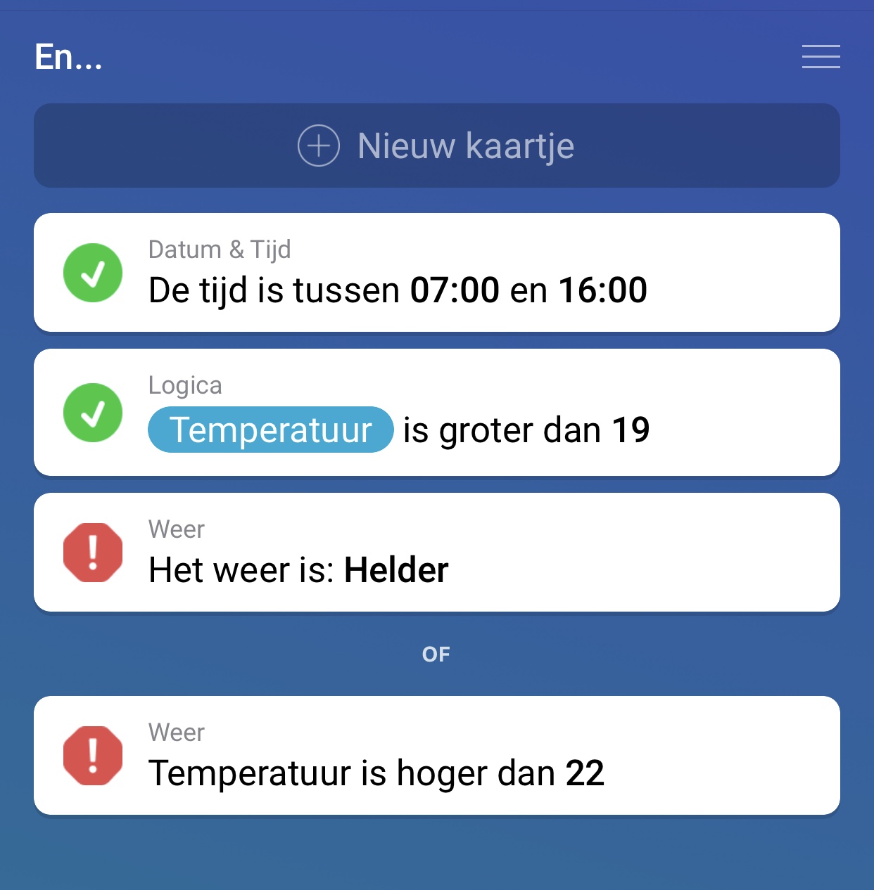 (En de tijd is tussen 7 en 15, en de veranderde temperatuur (uit de als) is hoger dan 19, en het is helder weer) OF (en ik hoop dat dat de voorgaande 3 overrulede) hetwordt warmer dan 22 graden (weer die 433 ontvanger)