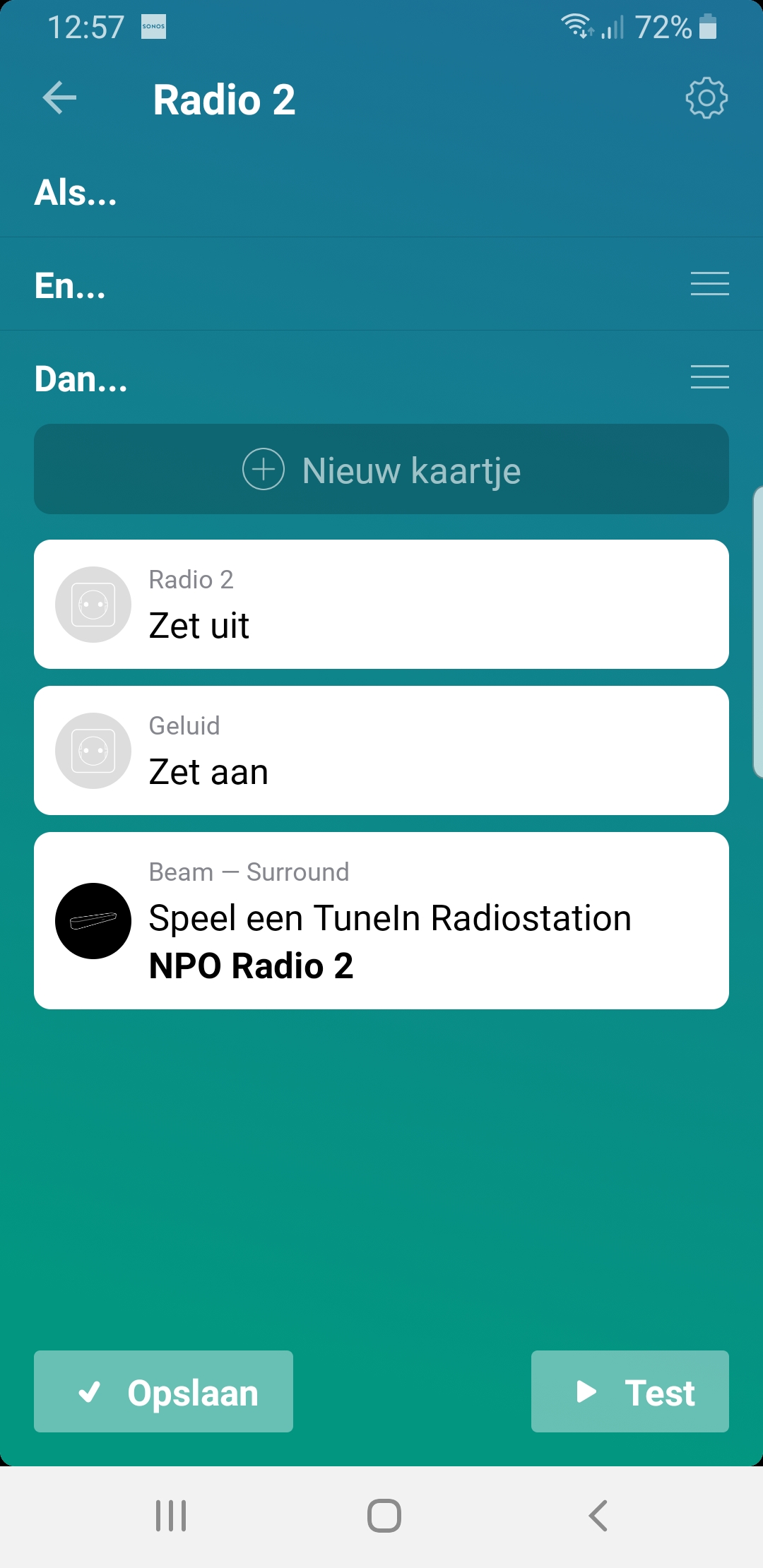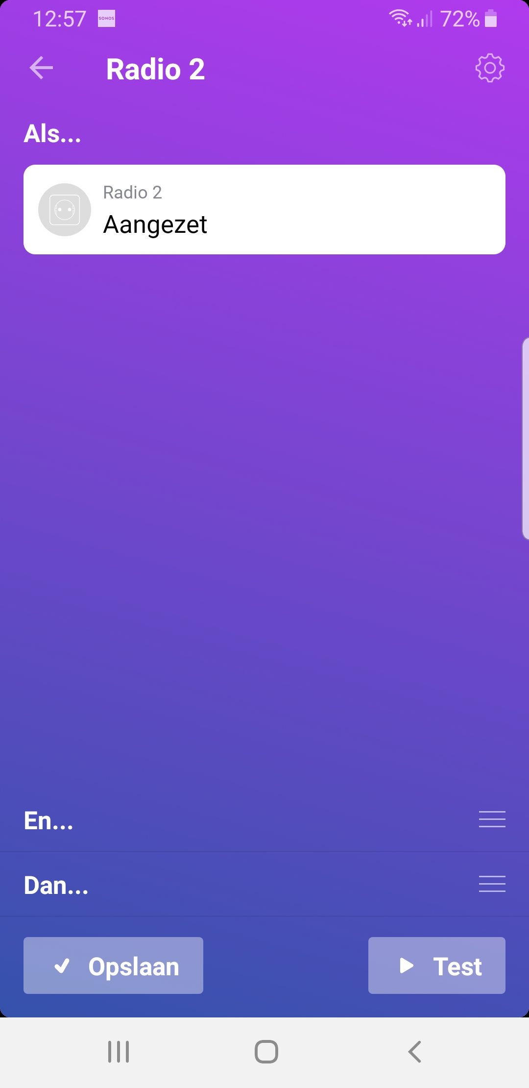 Ik heb een flow aangemaakt die wordt gestart als Radio 2 wordt aangezet. De acte is dan het weer uitzetten van Radio 2 en het aanzetten van Geluid.