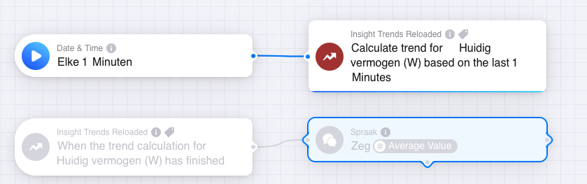 Dan laat je het 2e deel vd flow triggeren door de “wanneer trend berekening voor [ … ] gereed is” kaart, zoek wederom hetzelfde apparaat en waarde.