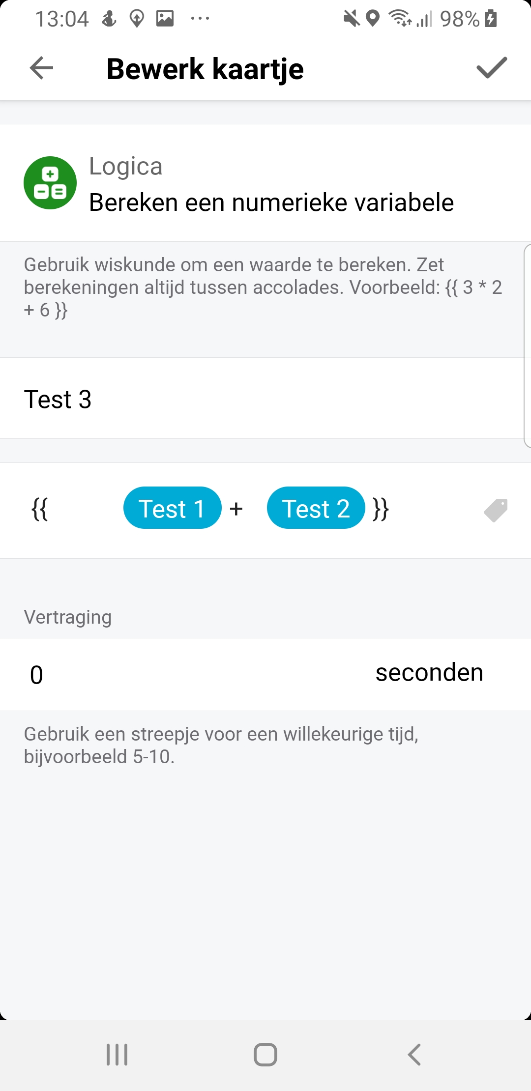 The top line (Choose an item) is the variable which will get the outcome assigned to it. I made three number variables, test 1 (5), test 2 (15) en test 3 (-6). In this example, we’ll set the first line to test 3. We want test 3 to be the outcome of test 1 and test 2 added up. So in the second line, which reads ‘Waarde’ (‘Value’ in English), we type {{. We then click on the tag on the right hand side of the screen and select the test 1 variable. Next, we hit the + button. We click the tag again and add test 2. We finalize this by closing the calculation with }}. Your card should read: