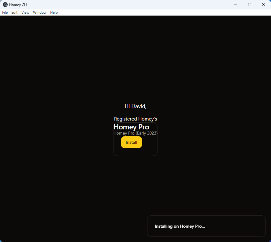 the âInstalling on Homey ProâŚâ just scrolled off to the left.
