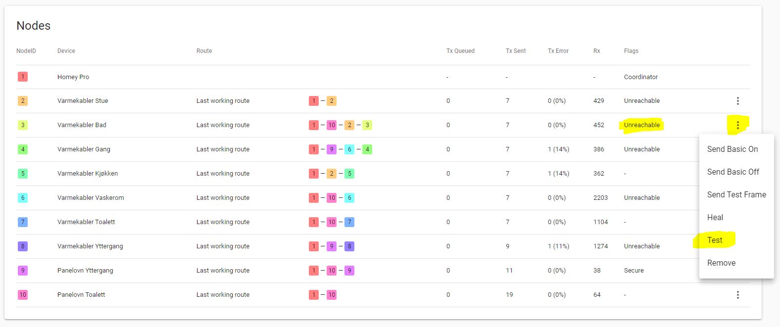 Node 2 – 8 are Z-TRM2fx devices. 9 and 10 are two different Fibaro devices. If I do a test on an unreachable device, it reports OK and the unreachable flag is removed. After a while the flag is set again. The Fibaro devices are never flagged as unreachable.