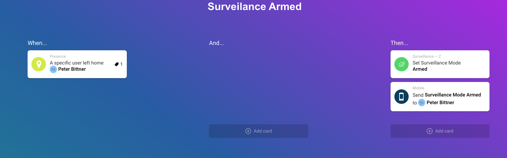 You can use any card you like in the Then⌠column, thatâs up to you. I see you send messages to your mobile on arming and disarming, you can do the same with the Pre Arming check.