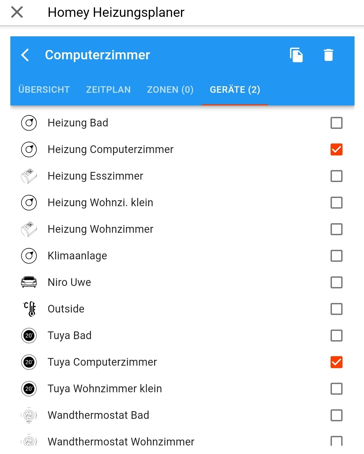 Ich habe einen Tuya Thermostat mit dem Heizplan am Laufen funktioniert gut. Wobei ich im Gegensatz zu dir nicht die Zone, sondern die Geräte ausgewählt habe.