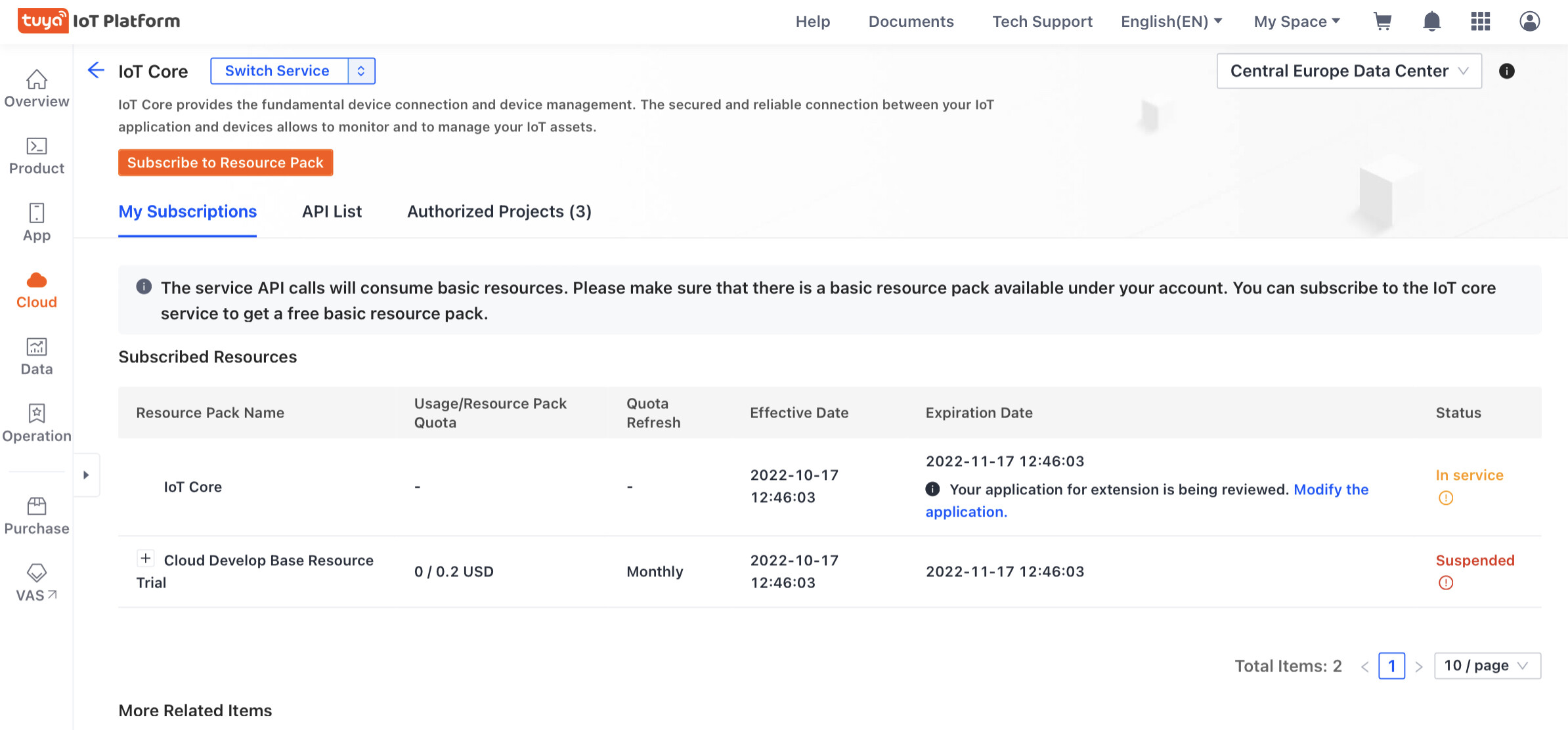 Intussen heb ik gemerkt dat bij Service API (auth.tuya.com), bij IoT Core, de uiterste gebruiksduur is verlopen. Kan dit mogelijk de problemen veroorzaken?