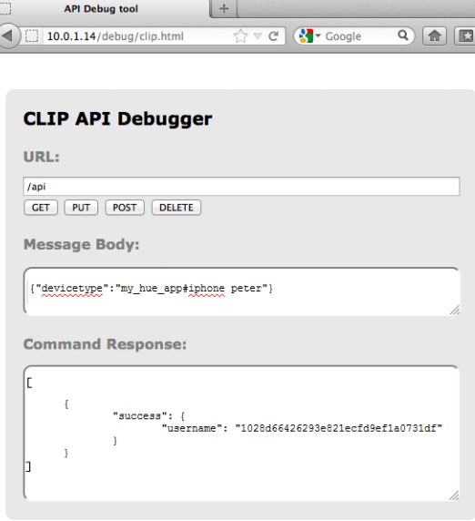 Open the API Debug tool at https://192.168.1.XX/debug/clip.html