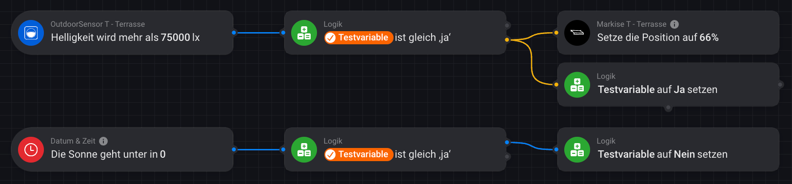 Ansonsten sollte der Flow eigentlich funktionieren, vorausgesetzt die Helligkeitsänderung findet in dem definierten Zeitraum statt und der Status der Rollos stimmt.