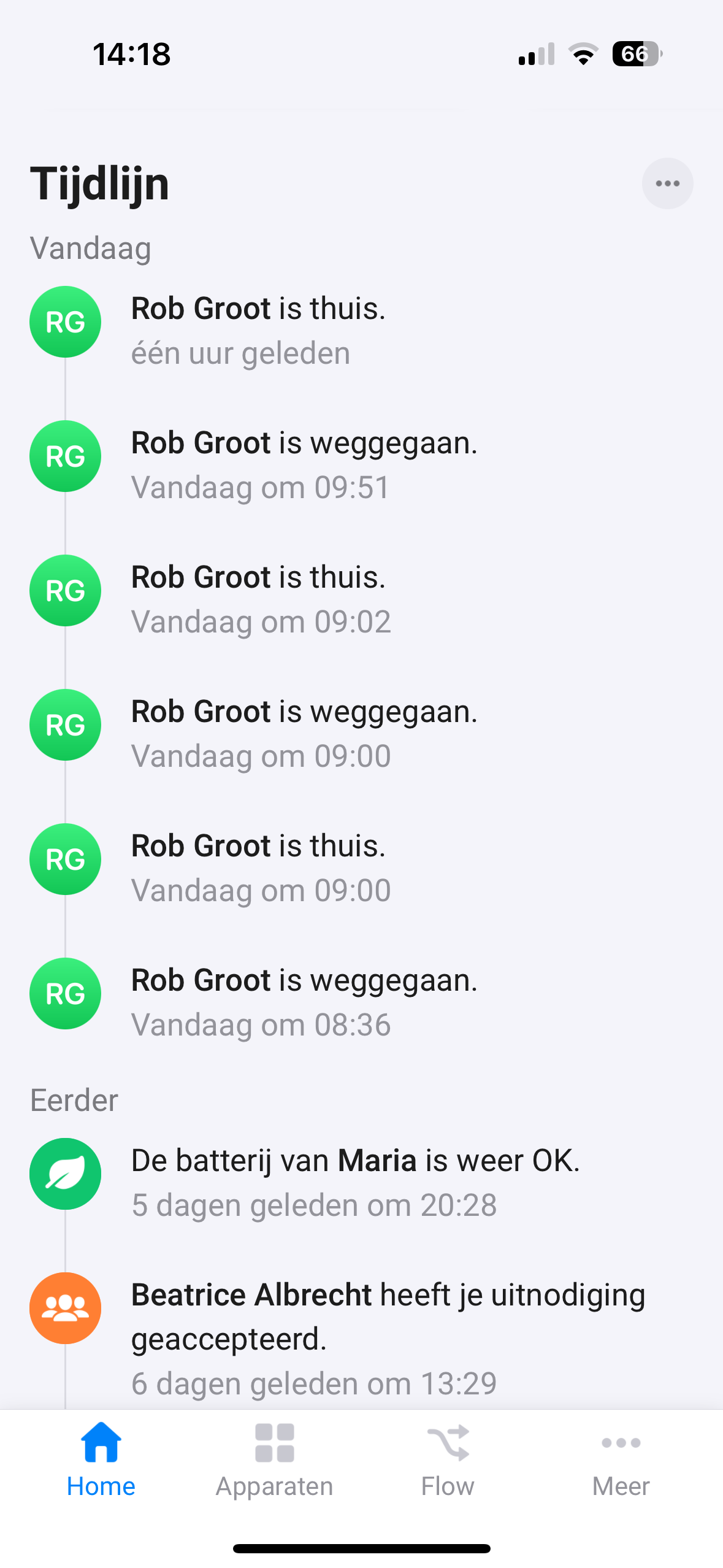 If you go to the homey app on phone from Beatrice. Select ‘More’ in the bottom, then click in top on user name. It says something like "Use presence detection (Gebruik Thuis/Afwezig Detectie). Is this selected??