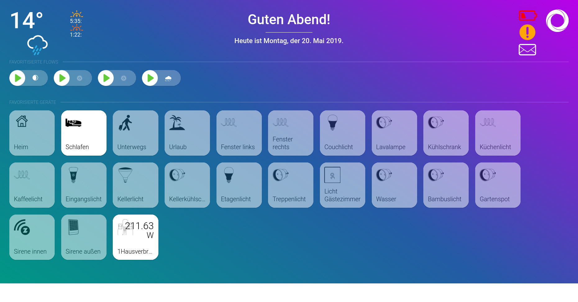 Ich habe meins etwas angepasst, als Basis nehme ich das von Danee de Kruyff und habe noch von Ruud ein paar Grafiken genommen. Und meine eigenen Anpassungen, bei Klick auf das Kamera Symbol kommen bei mit die Kameras die ich habe und das Haus Symbol ist ein Widget von meinem Stromzähler welches den Gesamtstromverbrauch aktuell anzeigt. Und wenn jemand klingelt zeigt es einen Snapshot der Outdoorkamera.