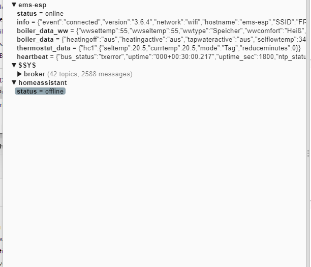 Ich habe jetzt eine Entität an MQTT angebunden, aber diese wird nicht in HomeAssistant eingelesen. Im MQTT Explorer sehe ich die Werte. Dort steht aber komischerweise, dass homeassistant offline sei.