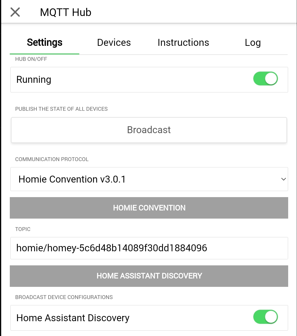So…jetzt kommt noch mal eine Frage für Unwissende…also für mich. Bei HA sehe ich jetzt alles (bis auf Tado aber davon mal ab). Aber wenn ich den Hub auf dem Rechner öffne werden wir drei Möglichkeiten angezeigt: Home Assistant Discovery, Homie Discovery und MQTT devices. Gehe ich auf HA Discovery soll ich da ein Topic eingeben. In dem Feld steht homeassistant/statestream. Was hat es damit auf sich?