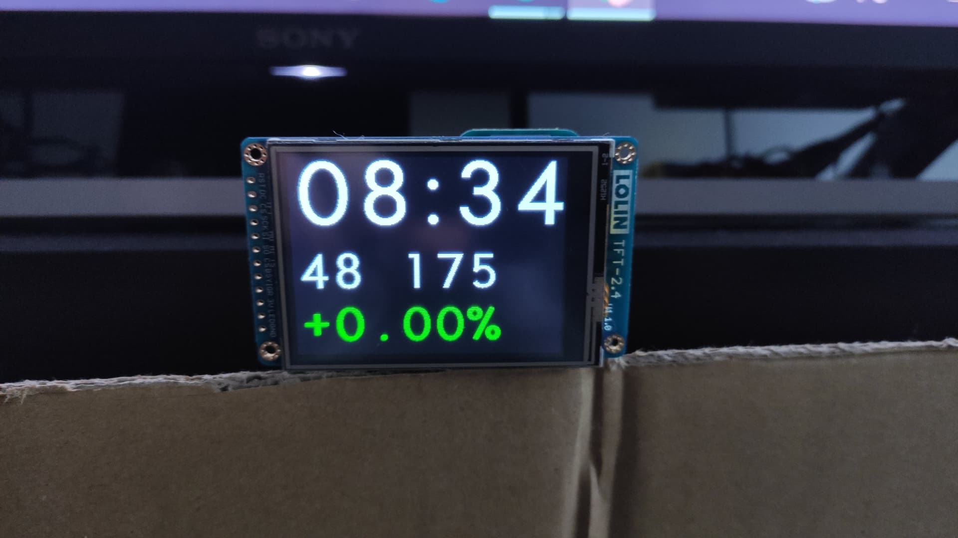 Display shows time, temperature IN and OUT, Bitcoin price and trend (+/- %/24H). If Bitcoin price get higher/lower than 5%/24H Homey send me alert using flow.