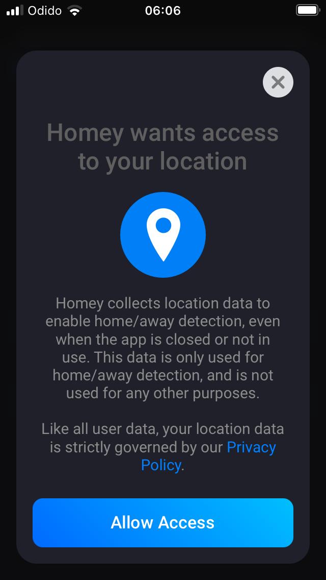 Sinds de Homey storing van vorige week en ik mijn Homey app opnieuw heb geinstalleerd op mijn iPhone ziet Homey mijn locatie niet. Bij mijn vrouw en dochter (ook iPhone) werkt dit wel. Zij hebben de Homey app ook niet opnieuw hoeven installeren.